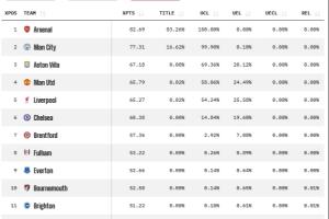 体育资讯03月02日讯 英超第28轮结束,OPTA更新了英超夺冠概率,其中阿森纳83.26%领跑,曼城16.62%,维拉0.08%,曼联和利物浦0.02%,切尔西0%。