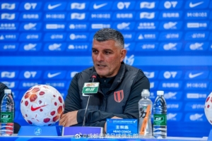 3月14日下午,成都蓉城队主教练约翰·阿洛伊西和球员胡荷韬出席了赛前新闻发布会。