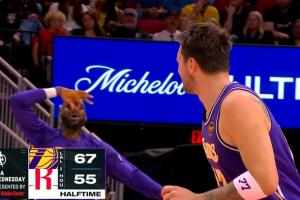 GIF-东契奇快攻上篮 詹姆斯开嘲讽 东契奇比了个2:都是2分嘛!