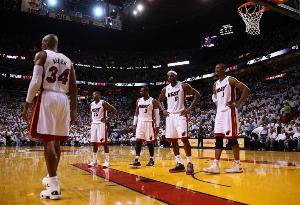 然而,迈阿密突然在外线找到了手感。巴蒂尔命中了三个三分球,雷·阿伦也命中了两个。骑士队则无法投进一球或抢到防守篮板。詹姆斯在第四节开始时连续命中了三个三分球,热火队以一波45-12的攻势扭转了比赛局势。
