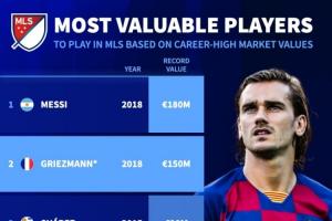美职联球星巅峰身价榜:梅西1.8亿欧居首,格列兹曼1.5亿欧第二