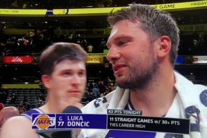 体育资讯3月26日讯 NBA常规赛,湖人客场137-130战胜步行者。赛后东契奇接受了采访。