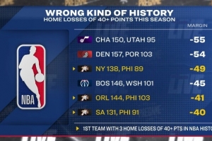 据统计,76人是NBA历史第一支单赛季至少3次在主场净负40分的球队。