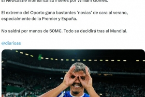 报道称这位波尔图边锋在夏季转会窗口前吸引了众多追求者,尤其是来自英超和西班牙的俱乐部。预计他的转会费不会低于5000万欧元。一切将在世界杯后决定。