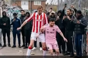 克劳奇社媒晒出AI视频,内容为他在街头足球中抢断梅西并破门,然后做出标志性的机械舞庆祝动作。
